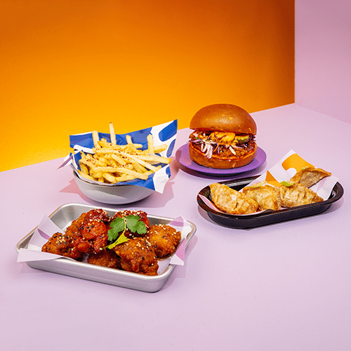 Gefrituurde kippendij bedekt met jouw keuze aan coating, gochujang-mayo, cheddar, sla, kimchi en sappige tomaat. Allemaal gehuisvest in een zacht brioche-broodje